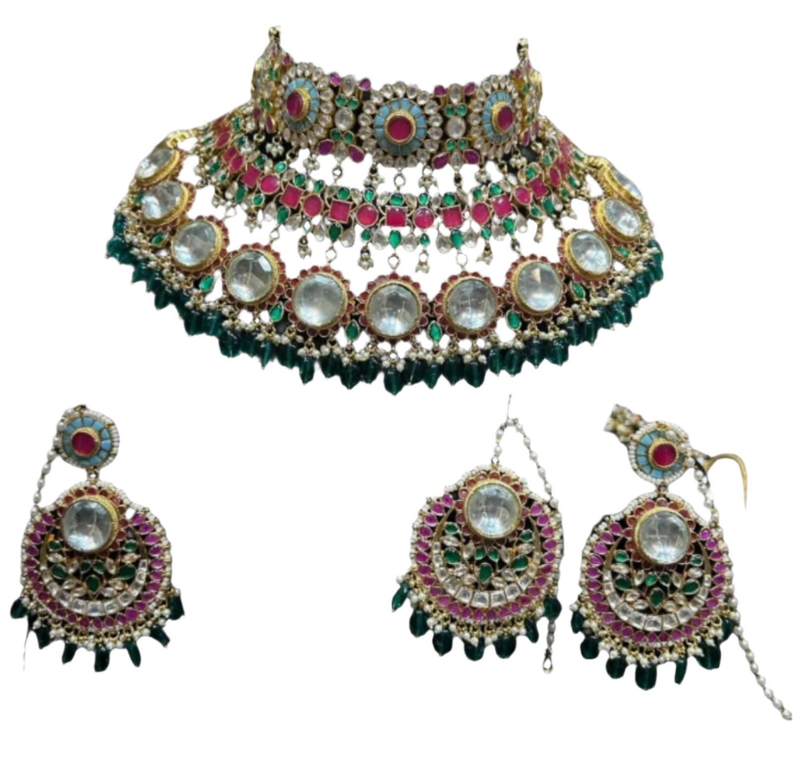 Necklace: The centerpiece of many jewelry sets, necklaces come in various lengths and styles, from delicate chains to elaborate pendants. They are designed to adorn the neck and can feature gemstones, pearls, or intricate metalwork. Earrings: Earrings complement the necklace and frame the face. They can range from simple studs to elaborate chandelier designs, often incorporating the same motifs or gemstones as the necklace for a unified look.