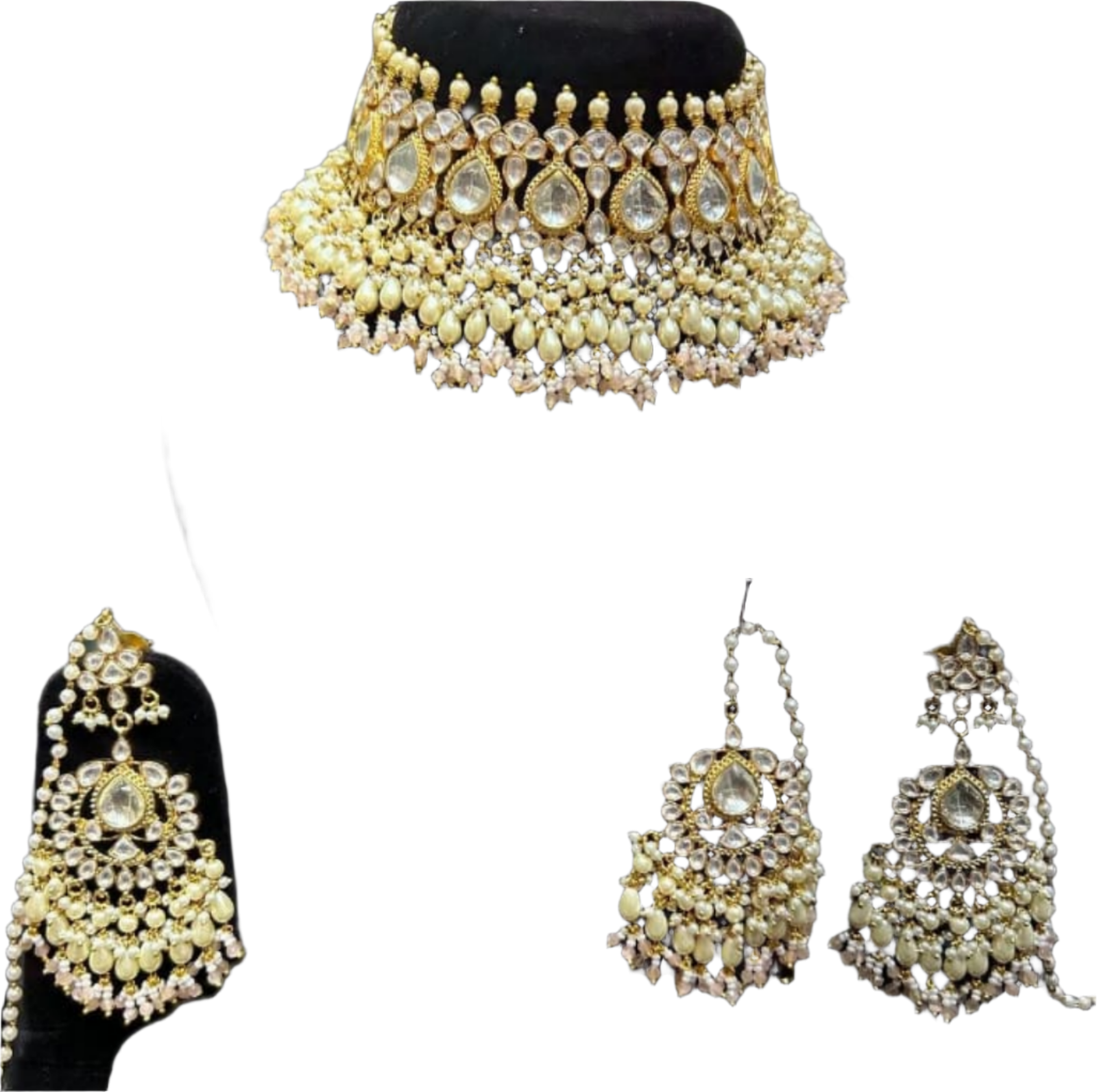 Necklace: The centerpiece of many jewelry sets, necklaces come in various lengths and styles, from delicate chains to elaborate pendants. They are designed to adorn the neck and can feature gemstones, pearls, or intricate metalwork. Earrings: Earrings complement the necklace and frame the face. They can range from simple studs to elaborate chandelier designs, often incorporating the same motifs or gemstones as the necklace for a unified look.