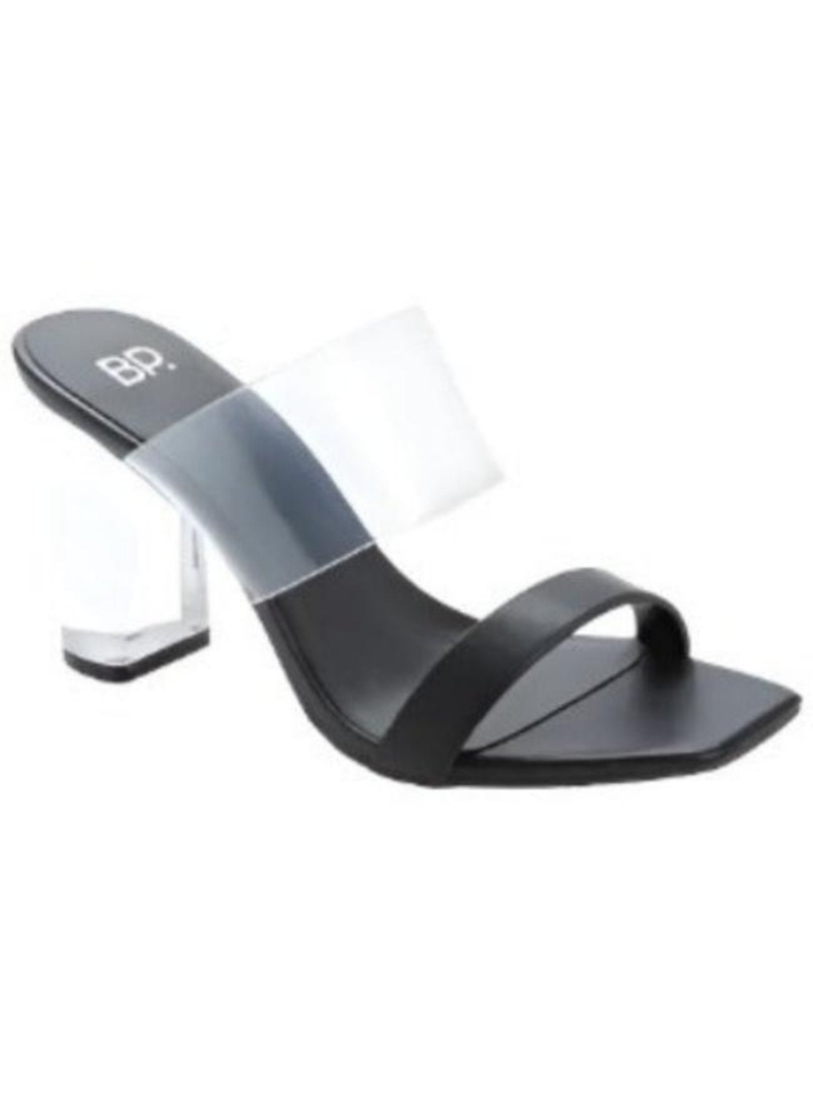 A clear strap brings night-out appeal to a chic slide sandal lifted by a transparent Lucite or wrapped block heel.