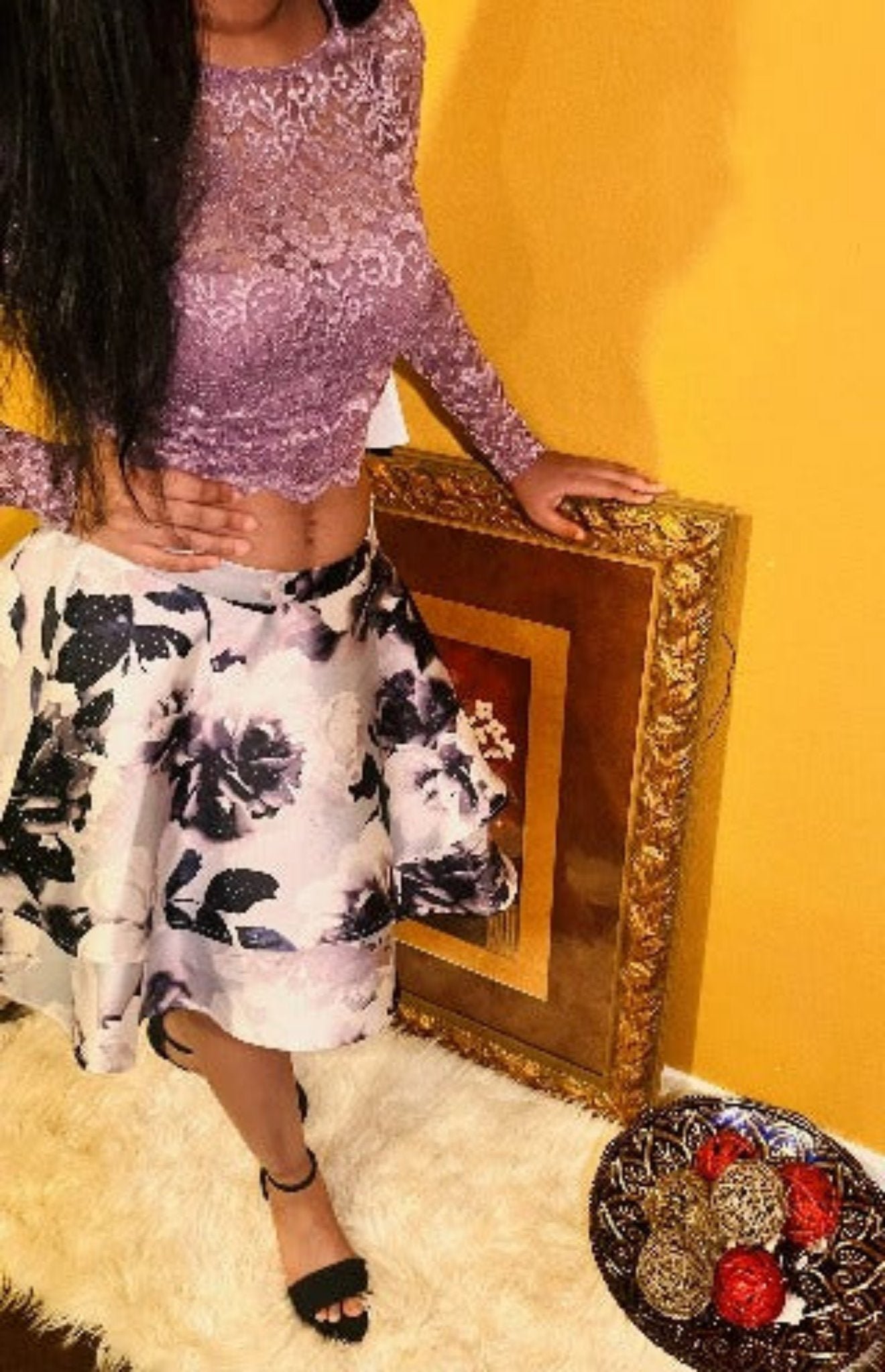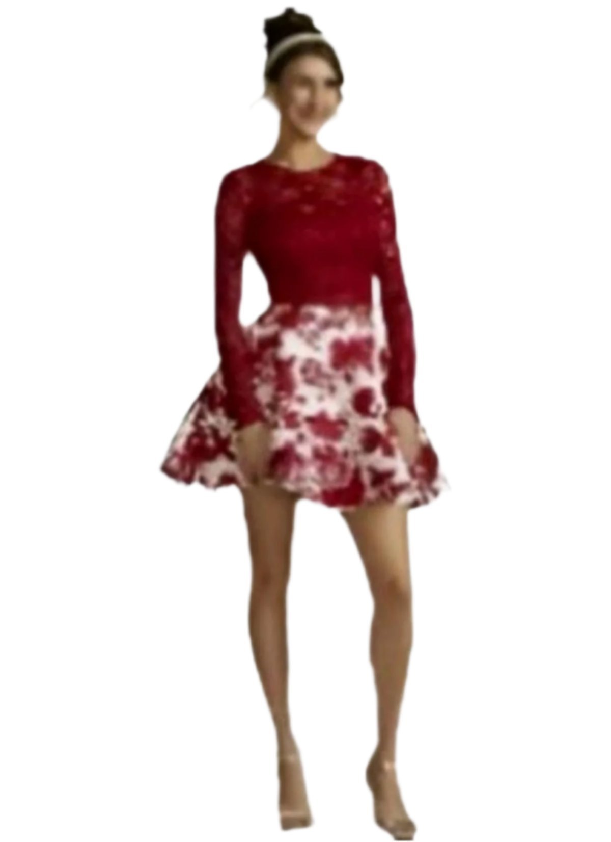 City Vibe Long-Sleeve Lace Top with Floral Skirt Two-Piece Dress