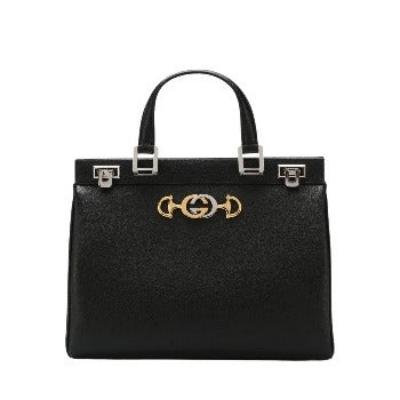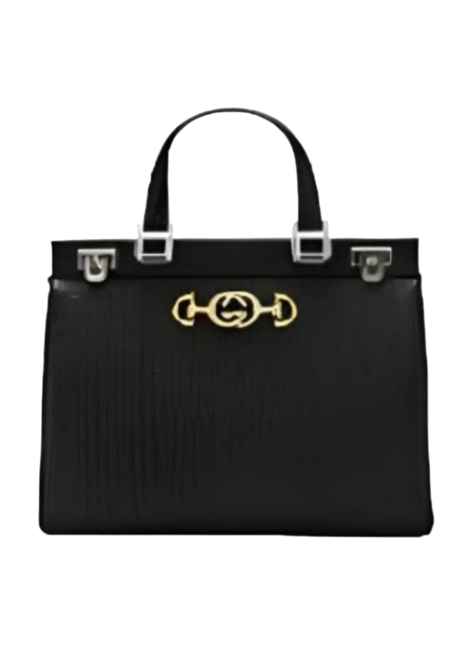 The hardware is presented in a modern mix of silver and gold tones on a top handle bag. This has top handles, three interior gussets, inner zippered pocket, lock closure, silver and gold tone GG